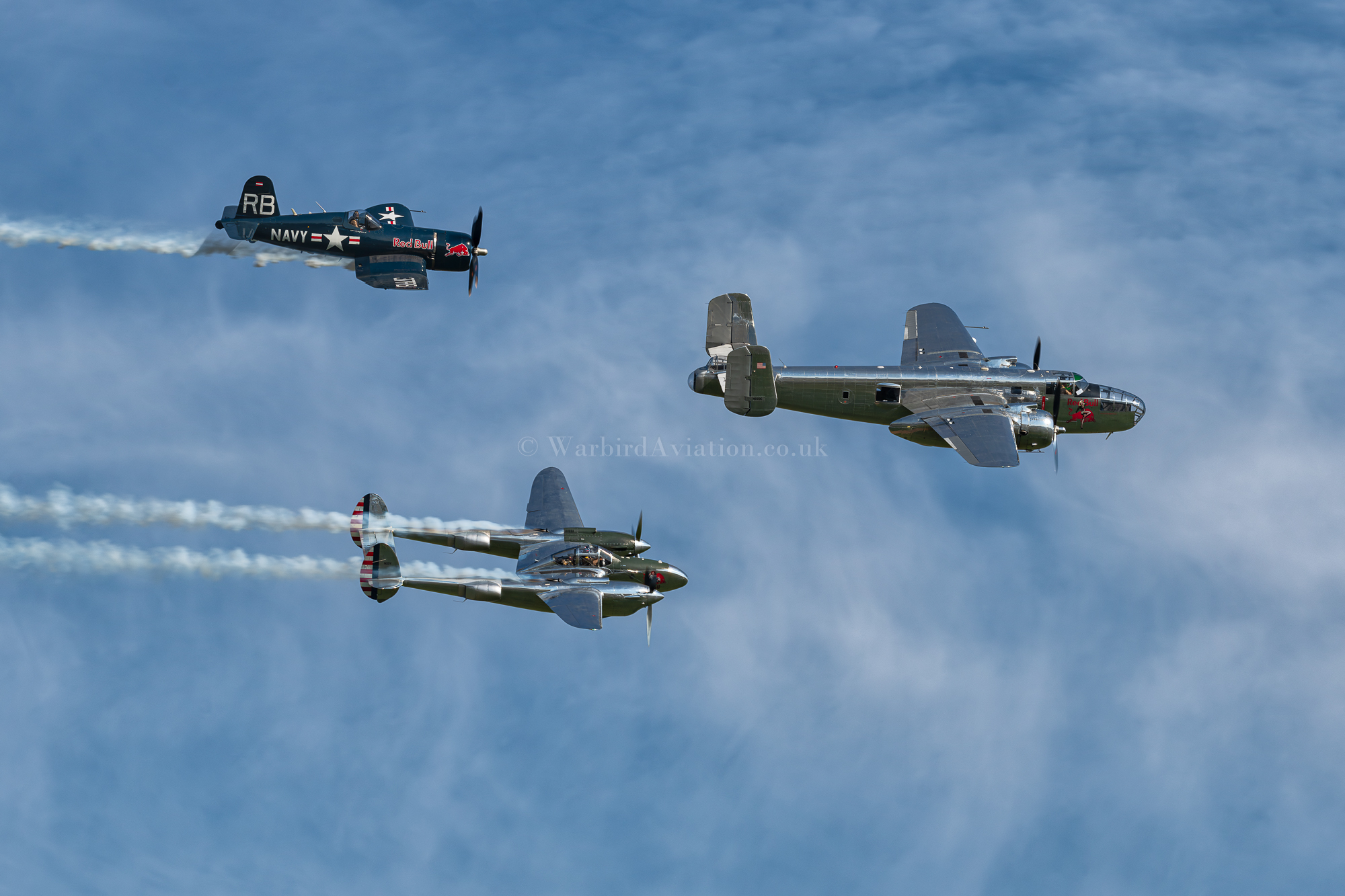 The Pacific theatre element featured the Flying Bulls P-38 Lightning, B25 Mitchell and Corsair F4U-4 in their usual 3 ship display along with another 2 Corsairs, P40 and newly restored P-51 Mustang ‘Miss aVa’.