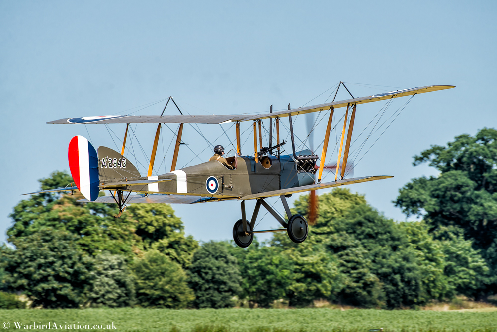 The BE2 and Avro 504K displayed together, flying tight circuits before opting to take advantage of the new meadow landing area to the far end the airfield due to the on crowd crosswind. The Bristol F2B Fighter was next to go up. Contrasting the three year gap between the BE2, the Bristol F2B Fighter was fast and maneuverable and with its rear gunner was very effective in a dog fight. RAF BE2 A2943 was built and owned by The Vintage Aviation Ltd (TVAL) in New Zealand and on loan to the WW1 Aviation Heritage Trust. This is the later model of the BE2, enhanced to make it more maneuverable and was the first aircraft type to cross the channel with the Royal Flying Corp during the Great War.